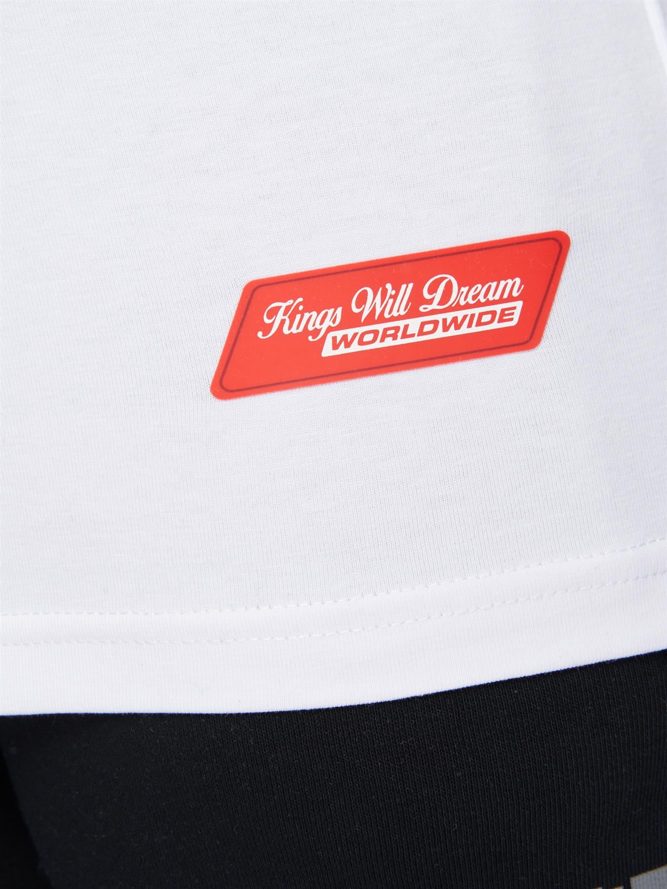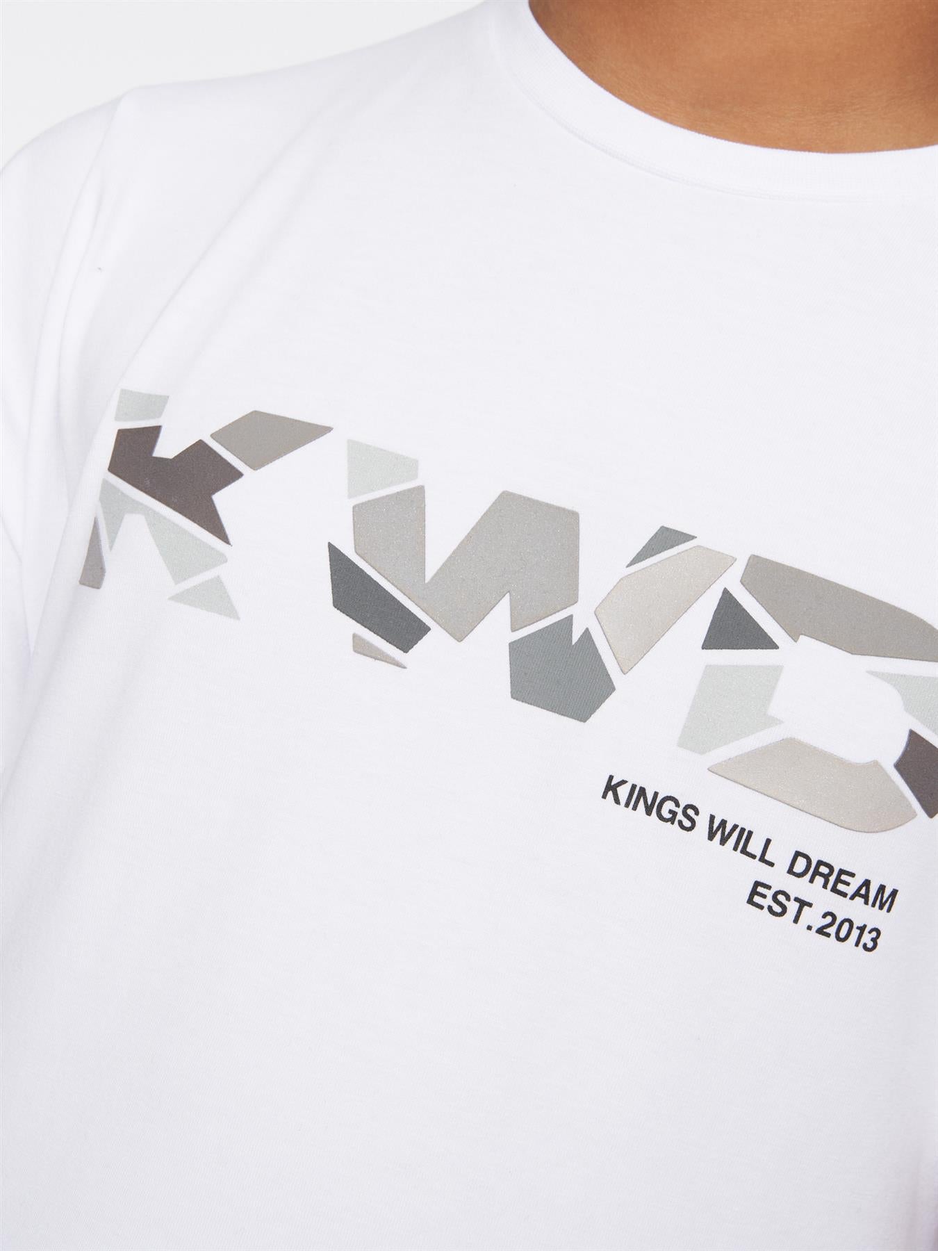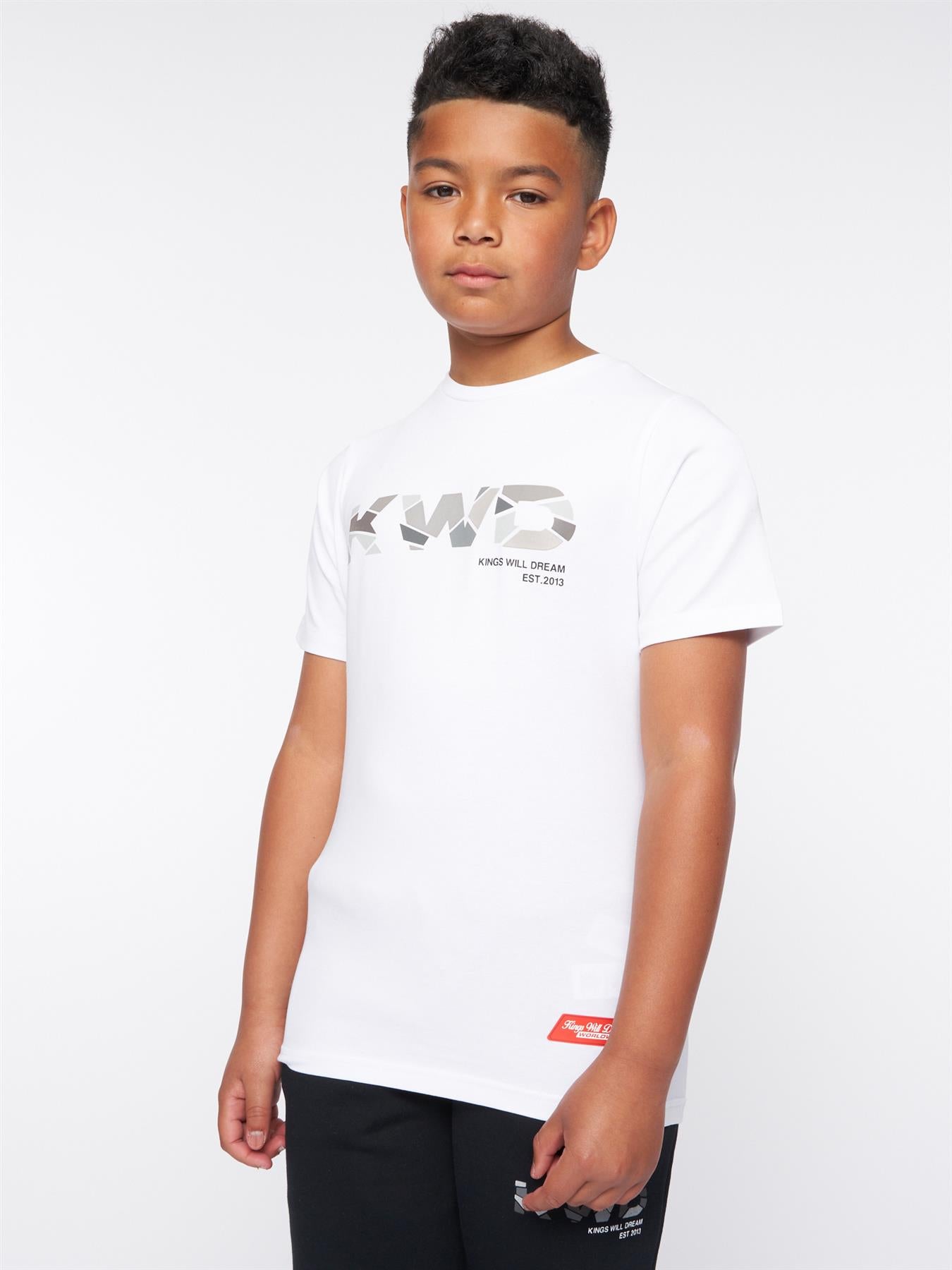 Kings Will Dream Junior Fracture T-Shirt in Optic White and Grey Reflective. A timeless casual legend that will never be broken, this short-sleeved wonder is cut into a regular fit from stretchy cotton-rich fabric for perfect everyday wear. With a rib crew neck collar, straight cut hem, large colourful Kings Will Dream logo to chest and smaller branding label above left hem. 96% Cotton 4% Elastane excluding Trims
