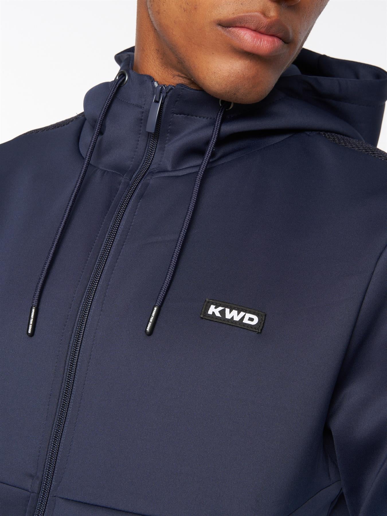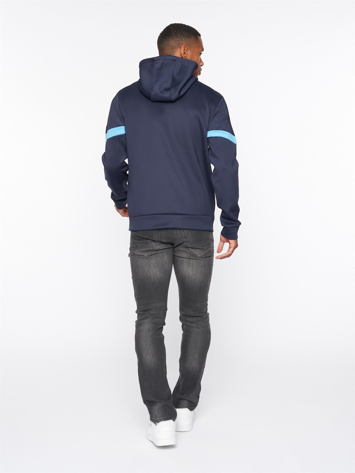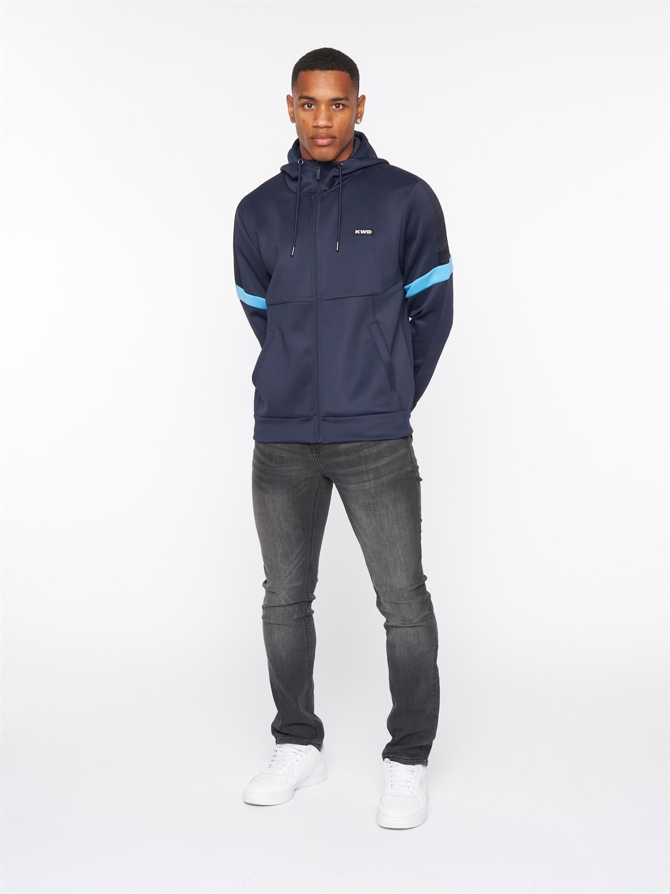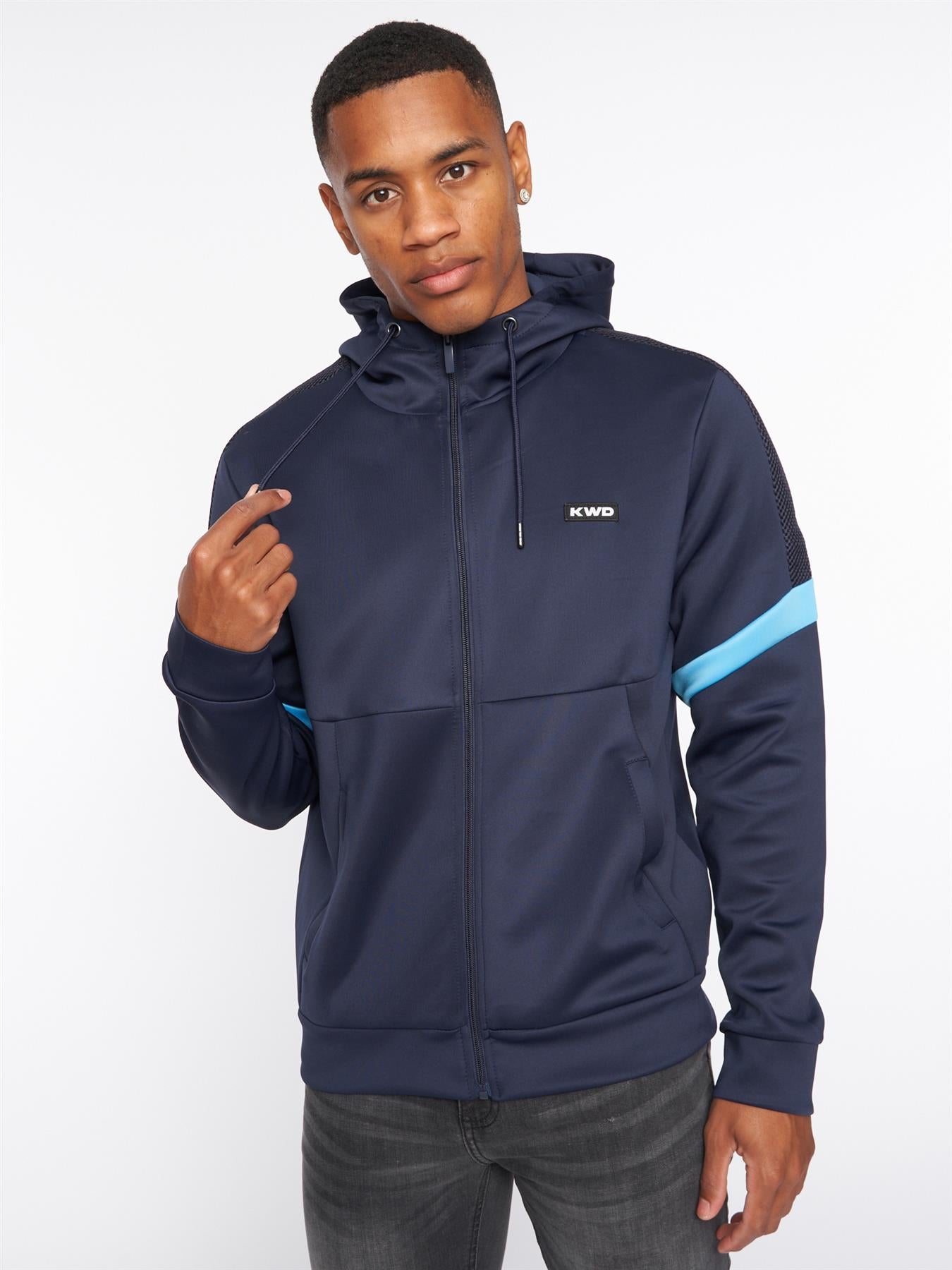 Kings Will Dream Kadar Zip Hoodie in Navy Blazer and Swimcap. Full zip fastening layering favourite that feels as good as it looks thanks to the stretchy and comfy fabrication. With an adjustable tipped drawstring hood, rib cuffs, handy front pockets for either your hands or small belongings, and contrast bands to sleeves. Kings Will Dream branding to left chest. Regular fit. Main Body - 95% Cotton 5% Elastane Panel- 100% Pol