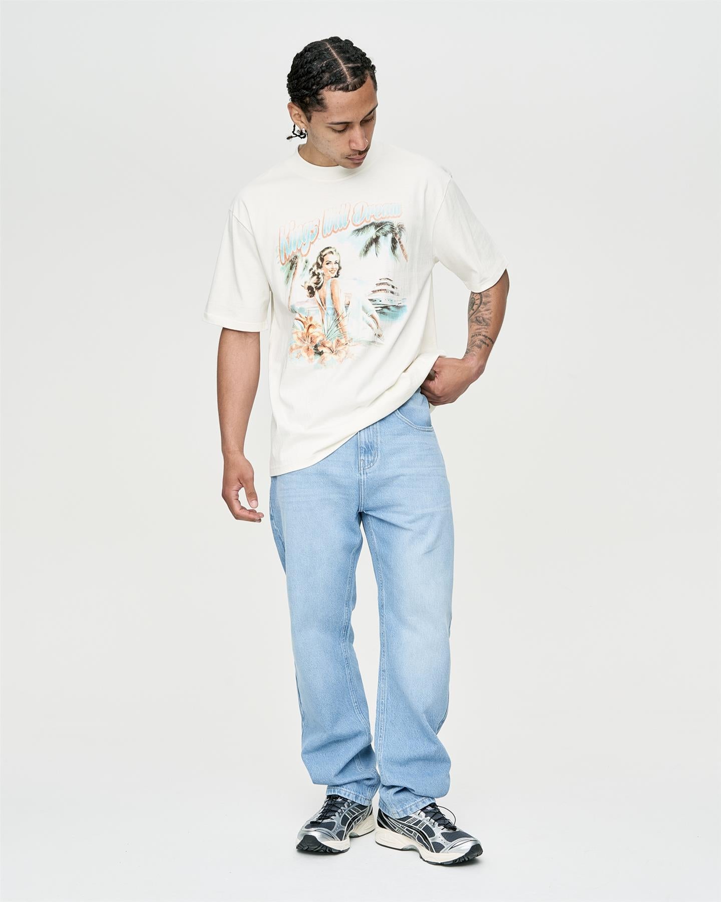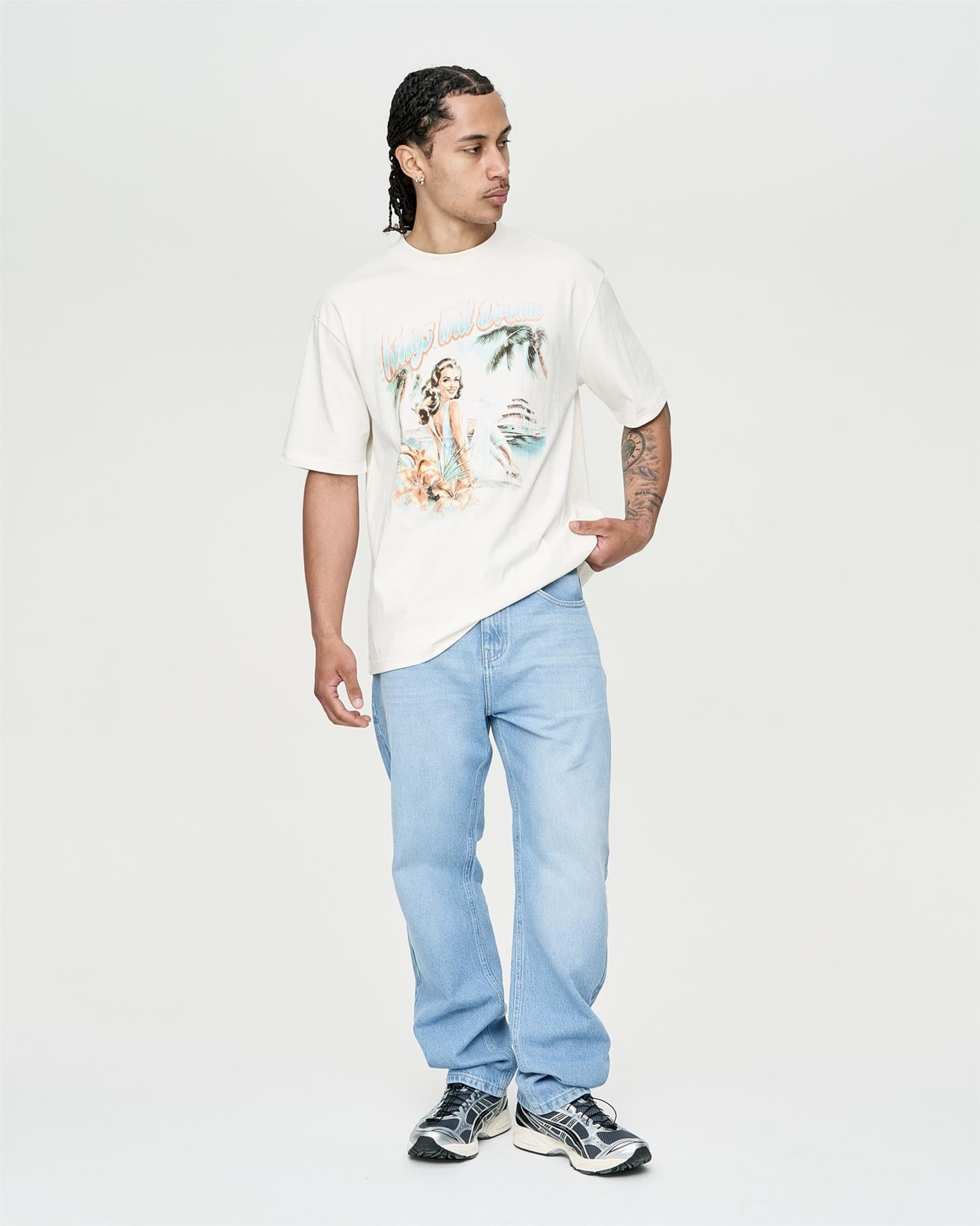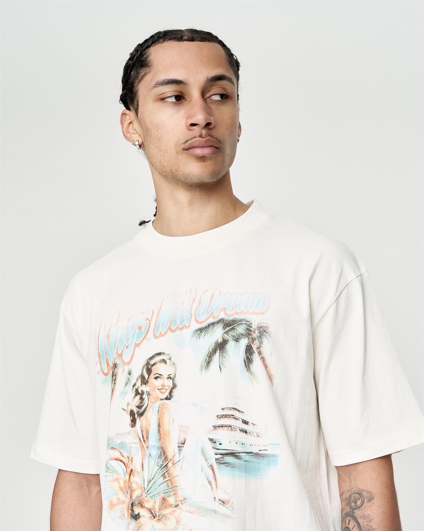 Introducing the Studio Paradise Island T-Shirt, a men's cotton heavy jersey tee with a deep neck rib. Designed with a slightly oversized fit and drop shoulders, featuring non-feel print at chest and back. Explore more from the collection here.